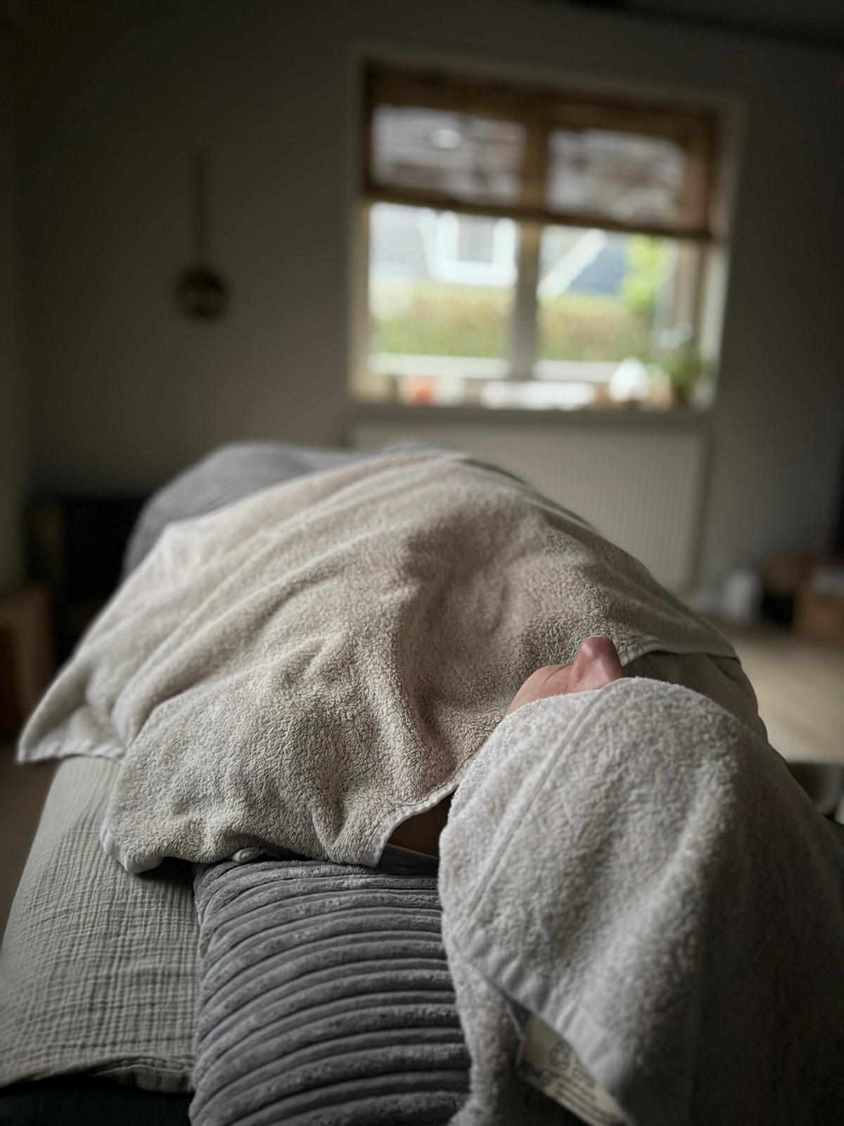 Tijdens de marma-behandeling lig je comfortabel op een verwarmde massagetafel, toegedekt met handdoeken en een warme deken, zodat je je volledig kunt overgeven aan ontspanning en verstilling.